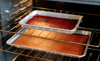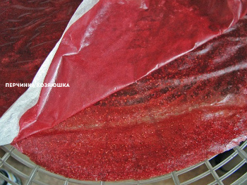 Если у вашей сушилки предусмотрены силиконовые коврики,то вам повезло.Ну а если они не предусмотрены,то не беда.Берем пекарскую бумагу и застилаем дно по размеру поддона,но только одним целым куском.Выливаем туда нашу перебитую ягоду толщиной в полсантиметра,выравниваем все ложкой и ставим в сушилку на максимальную температуру.