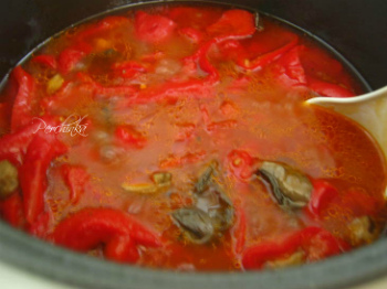В прокипевший томатный сок кладем перец,грибы, обжаренный лук , соль, сахар и варим 40 минут с момента закипания.