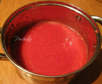 Помидоры помыть и перекрутить на специальной мясорубке для получения сока. Получившийся томатный сок варить полчаса,чтобы удалить лишнюю воду.